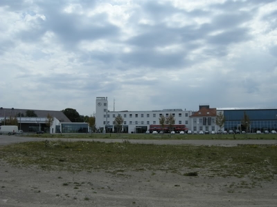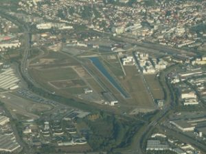 The former airport of Boeblingen, photo taken in September 2012 while on approach to Stuttgart airport. The long artificial lake indicates (more or less) where the runway used to be. The old terminal buildings can be seen just above the lake.