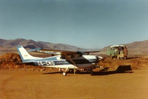 Another job for the Land-Rovers was removing great lumps of bedrock too massive to be dug up by the bulldozers. Left where they were, they would have been a potential hazard to aircraft. We dowsed the bedrock with petrol or diesel and set it alight. With the rock well heated, we chilled it with cold water. Chunks broke off, and were loaded onto the lorry load bed to be driven away. One big boulder did not break apart and needed towing or rolling away. As with the improvised grader, one Land-Rover was not enough, so, with two chained again in tandem, the task was completed – leaving Pelaneng Airport (IATA code PEL) at 7,200 feet altitude ready for its first arrival. George Hallowes – the engineer I worked with for most of my time with Binnie’s – flew in on the first plane. Shortly afterwards, on 12th June 1971, I went in and out on a Cessna 210.
