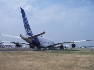 This is a picture of the Airbus A380 parked to the side of the runway during the Farnborough 2006 Airshow.